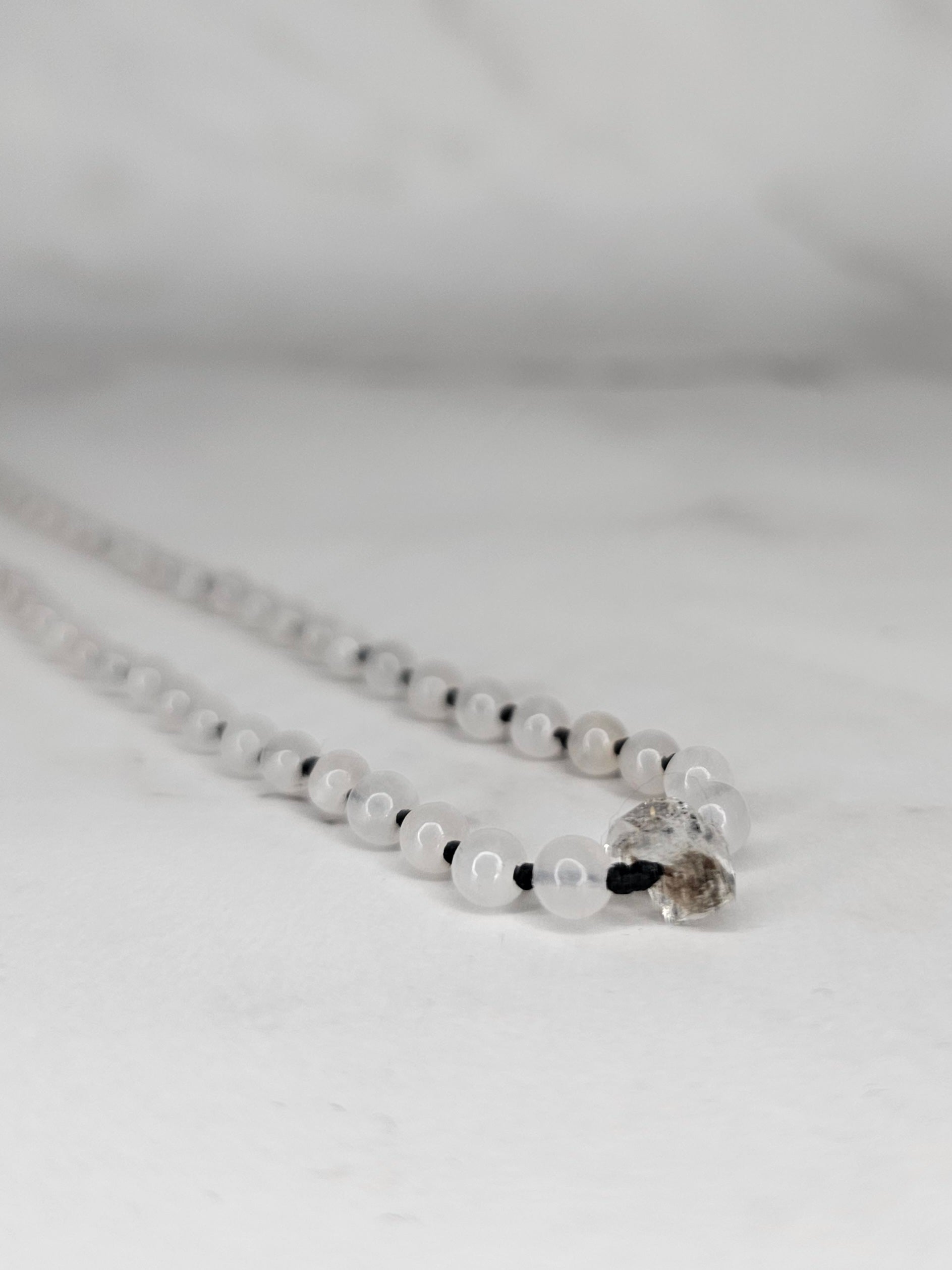 Herkimer Diamond is used to increase the vibrational output of the main bead of the necklace.